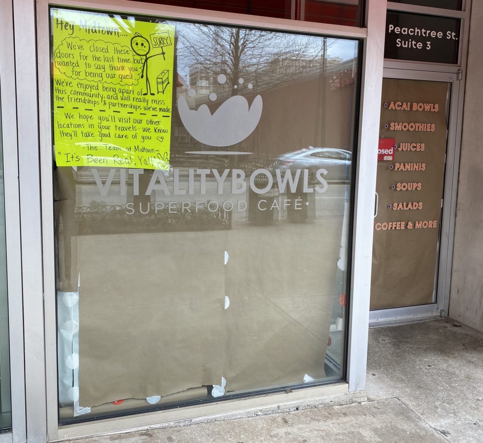 Vitality Bowls is the third restaurant to close in Viewpoint, at 855 Peachtree Street NE, in recent years, joining direct neighbors Purely and World of Beer (now a T-Mobile store), all of which are adjacent to one another.