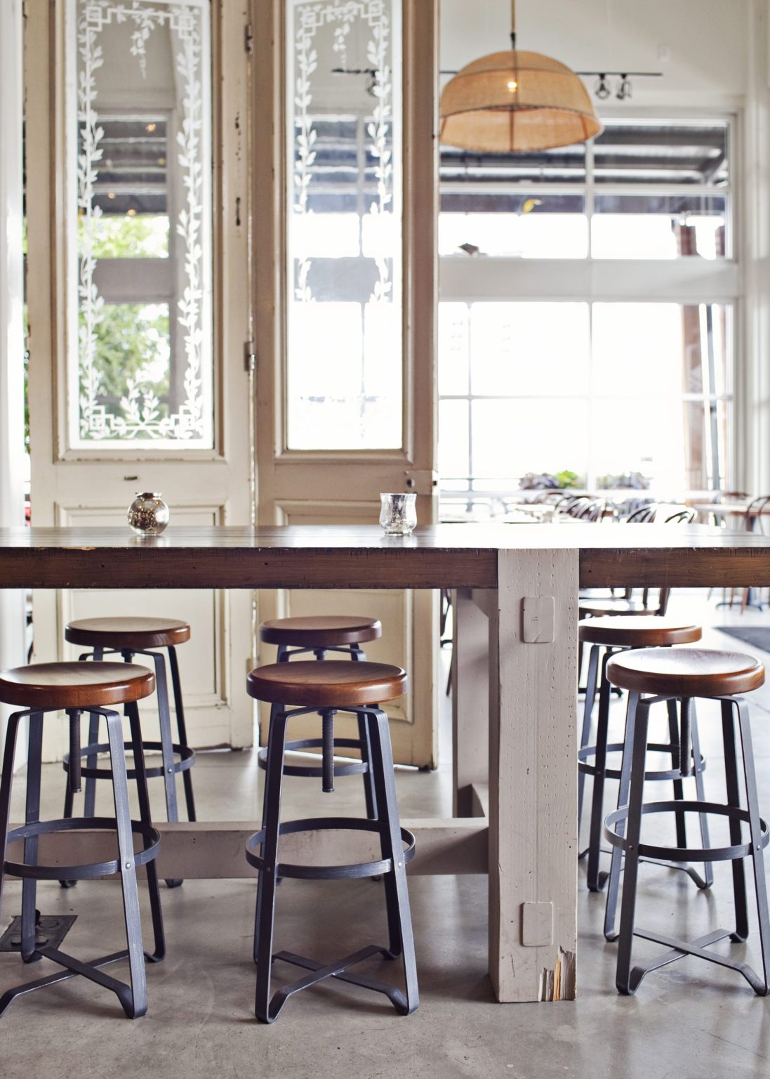 West & Mill’s interior features leather couches, a fireplace and plush seating for bar guests. The bistro’s bar is made of reclaimed wood from a warehouse in south Georgia.