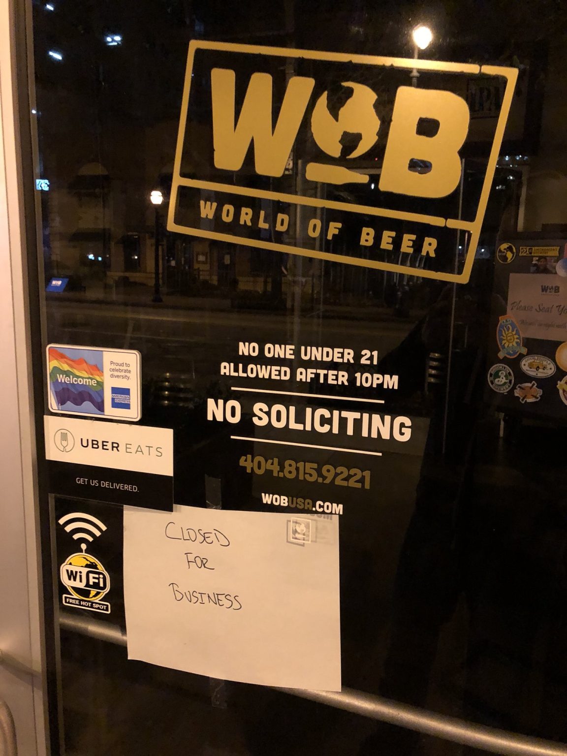 “World of Beer is tapped out in Midtown,” What Now Atlanta (WNA) reader @jefejet at 2:49 a.m. this morning tweeted with a picture of a “closed for business” sign taped to the restaurant’s main entrance.