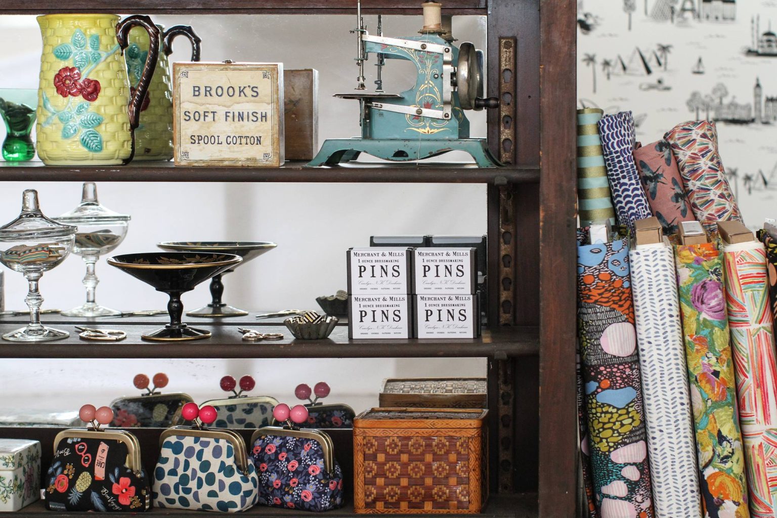 A vintage, glass-and-mirror shelved shop counter will serve as a focal point of the shop, and white metal racks will house items from patterned fabrics to accessories made exclusively for Topstitch.