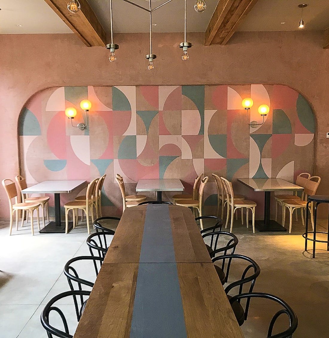 Smith Hanes Studio is behind the design of Halsa which includes black and white floor tiles and communal tables.