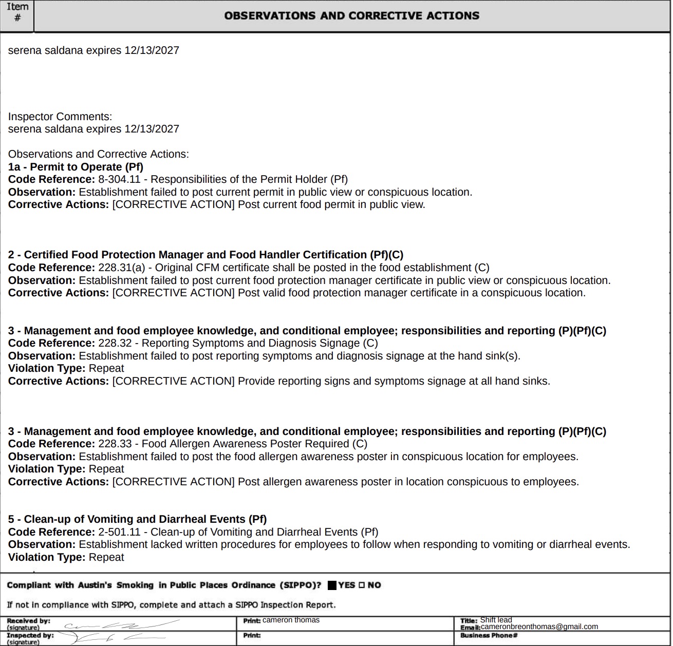- The establishment did not display its current food permit and food protection manager certificate in a visible location. Required signage, including employee illness reporting, symptom guidelines, and food allergen awareness posters, was also missing.