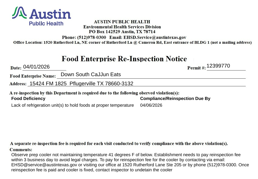 During an April 1 inspection, the Austin Public Health Department found Down South CaJJun Eats to be in violation of multiple health codes. The establishment received a score of 71.