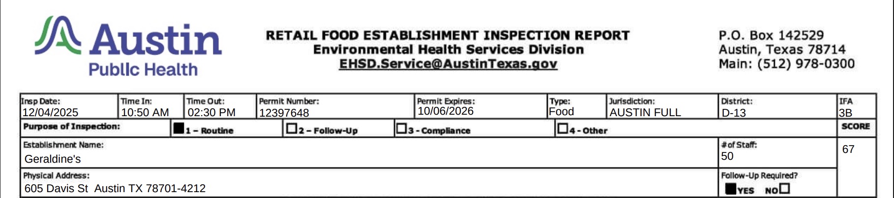 The Austin public health department carried out several health inspections in the area on December 4. Among those, Geraldine’s received low scores following a routine check due to improper food holding temperature and undated food.