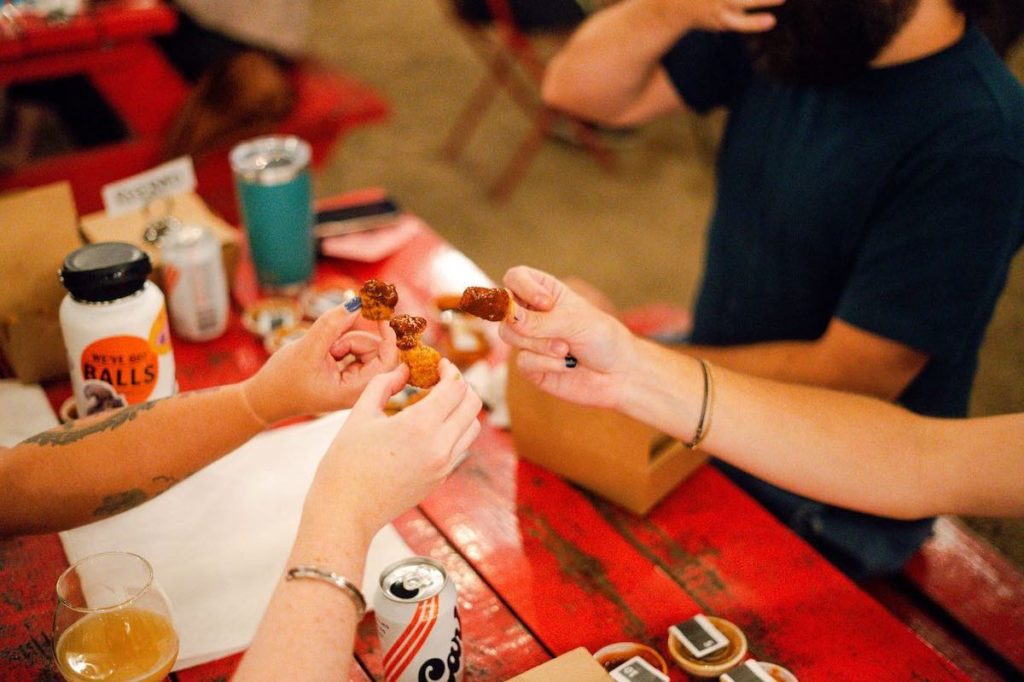 Like most major breweries in the area, St. Elmo serves a variety of beers on tap such as kolsch, imperial stout, English brown ale, IPAs, and other original brews. The brewery also serves wine, cider, and yerba mate. In way of food, the original location serves fried chicken dishes and curry plates under the Spicy Boys Friend Chicken brand.