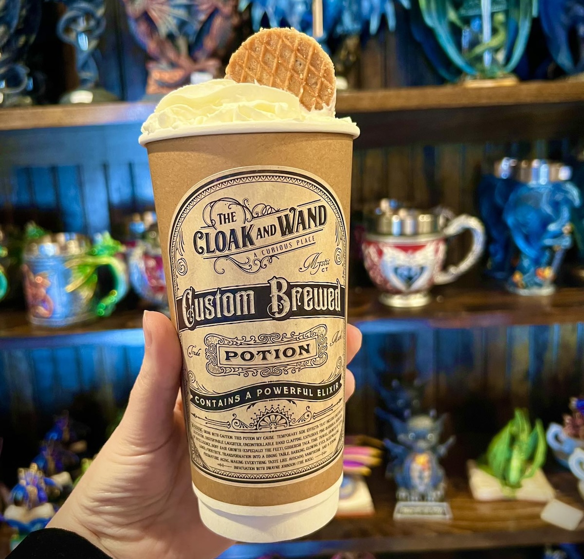 A centerpiece of the shop is the potion bar, where guests can craft non-alcoholic sodas and hot chocolate drinks using more than 64 flavor options. Cold potions can blend up to three flavors, while hot potions feature one.