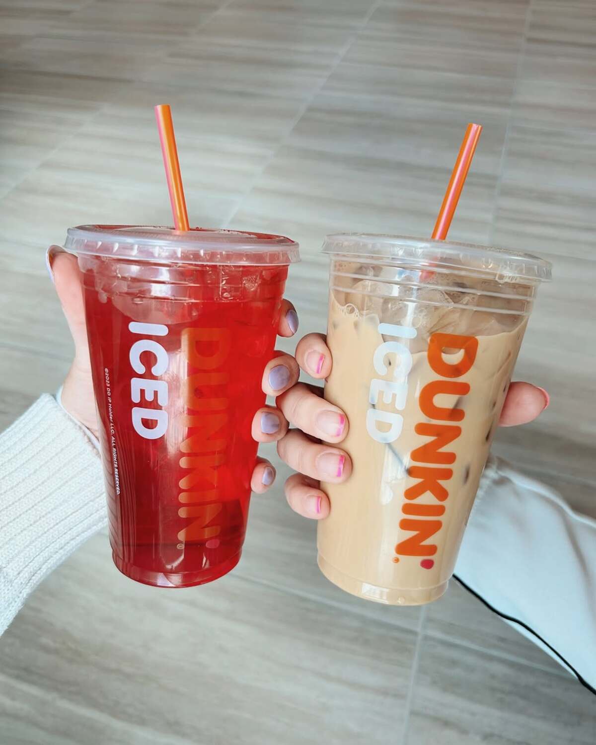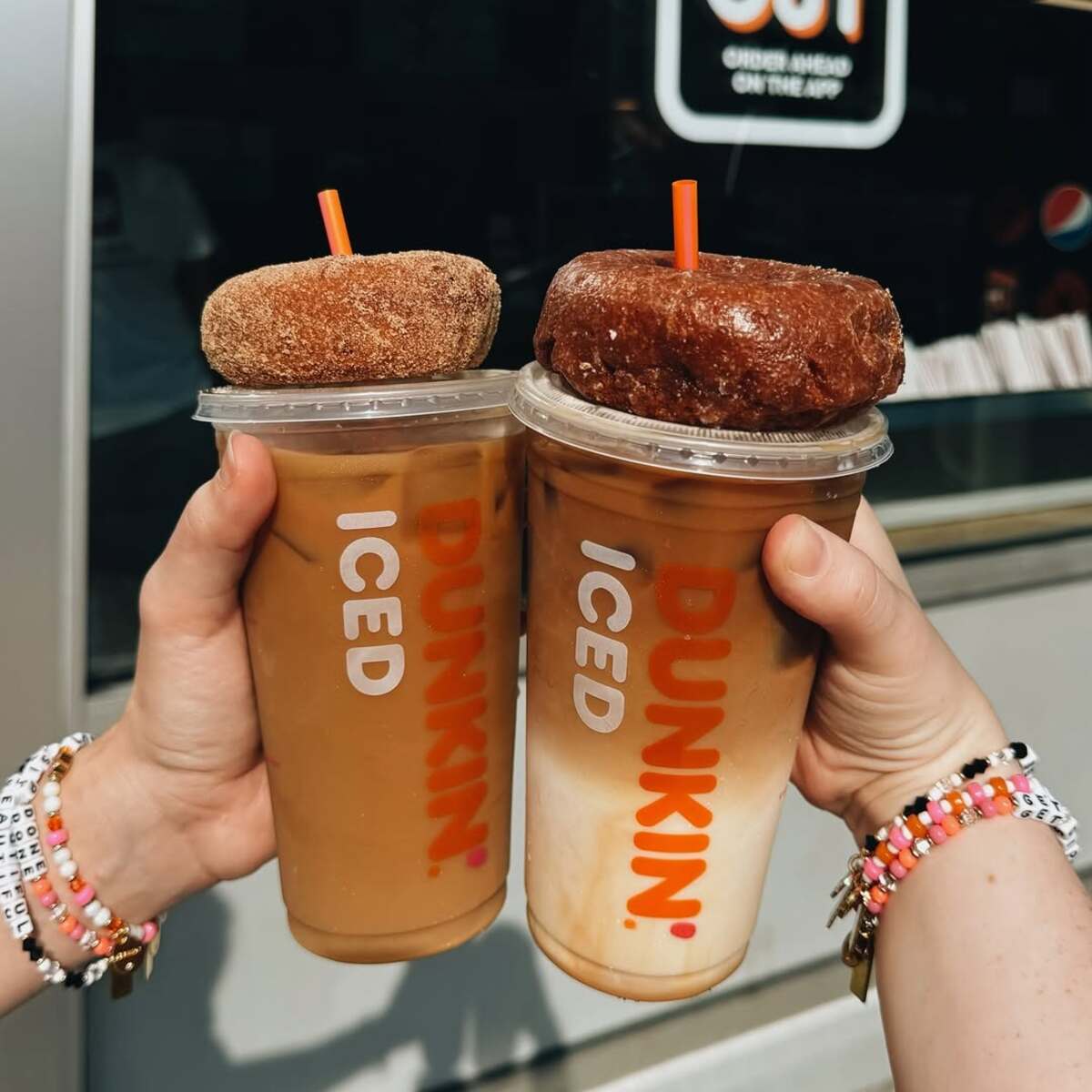 Two people hold their Dunkin’ drinks as they pose in a picture. (Image credit: Dunkin’)