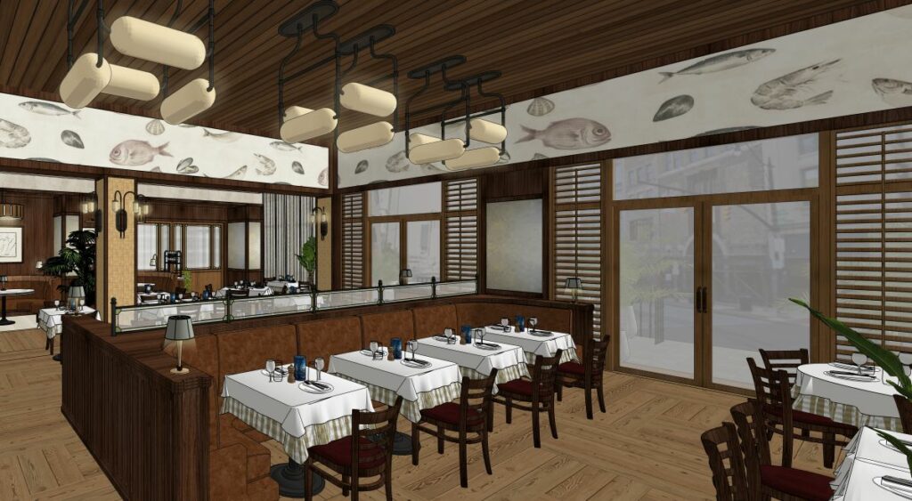 According to a press release shared with What Now Columbus, the restaurant’s interior will feature 17 foot ceilings, wood paneling and a hand drawn lowcountry mural by artist Scott Waterman. Adding to the decor will be brass fixtures and arched entryways as well as an outdoor patio that will showcase hand drawn illustrations and a sign proclaiming, “Cool Inside” and “Oyster Bar” by the original Hank’s Charleston artist, David Boatright. The back of the restaurant will feature a private dining room that can seat up to 22 guests that will also include a separate patio entrance.