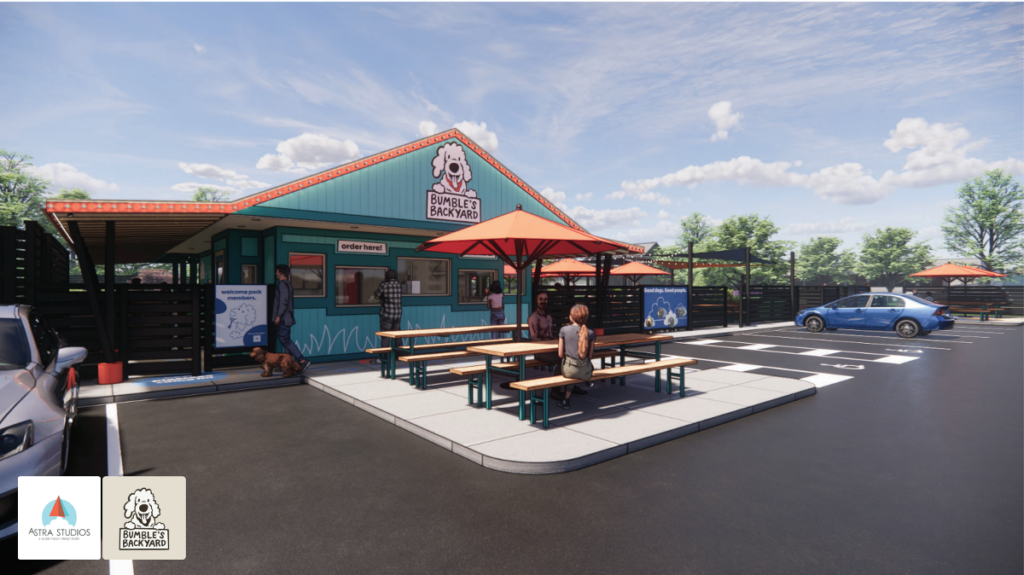 “We want to create a space where dogs, dog havers, and dog lovers can have fun together. Bumble’s Backyard will be a community cornerstone where dog people can come to take a morning meeting while their dog runs around, meet friends for a happy hour after work, or bring a first date to ensure your dogs get along,” said Lauryn Betterton, who owns the concept with her husband, Evan in a statement. “There is so much city pride in Columbus. Bumble’s Backyard will celebrate our city’s culture through locally sourced coffee, beer, and ice cream, furniture created by local craftspeople, murals painted by local artists depicting some of Bumble’s pals, and so many more little touches.”