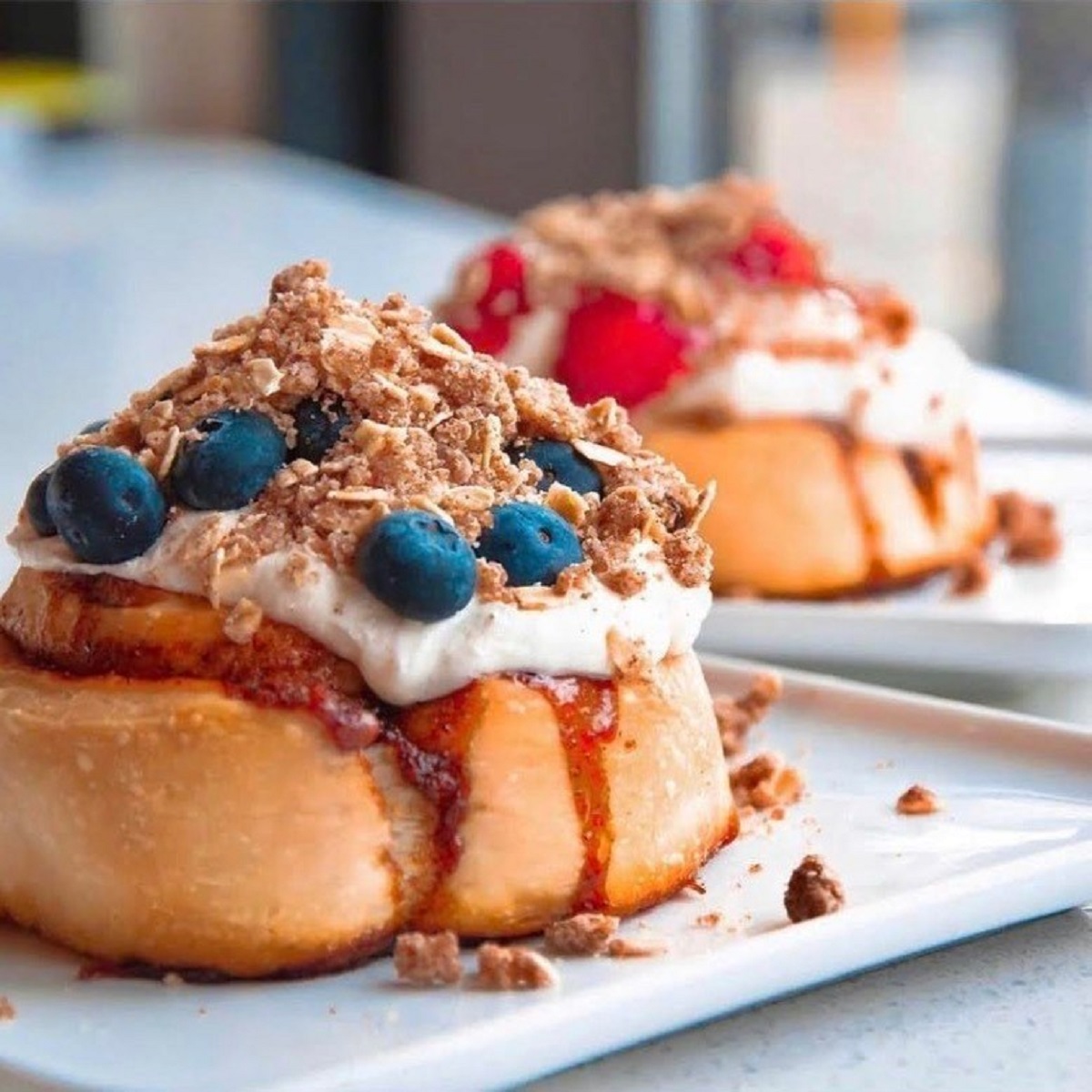 Cinnaholic offers several dozen frostings and toppings to add to the cinnamon rolls. Some frosting flavors include caramel, chocolate, maple, and cream cheese. You can then top it with ingredients such as pecans, pie crumble, pretzels, and raspberries. The combinations are endless! Signature cinnamon rolls are also available include the Old Skool, a classic cinnamon roll with vanilla frosting, the Campfire S’Mores, or the Caramel Apple Pie.