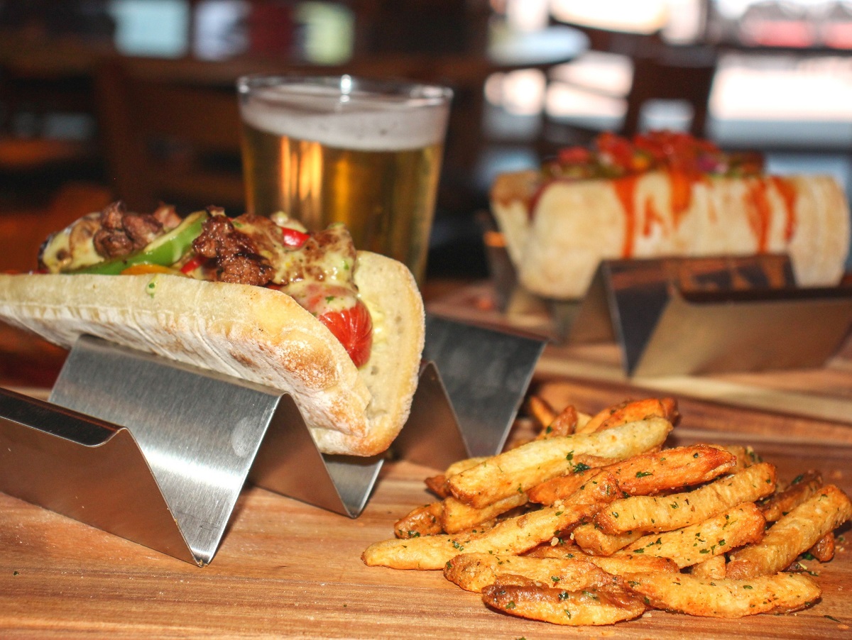 The Angry Elephant features gourmet hot dogs, burgers, sandwiches, salads, wings, nachos, and more. The bar and grill is well-known for its drinks and politically-themed menu items such as The George W. Bush BLT Dog, The Joe Biden “Shroom Dog, and The Bill Clinton Dirty Chili Cheese Dog.