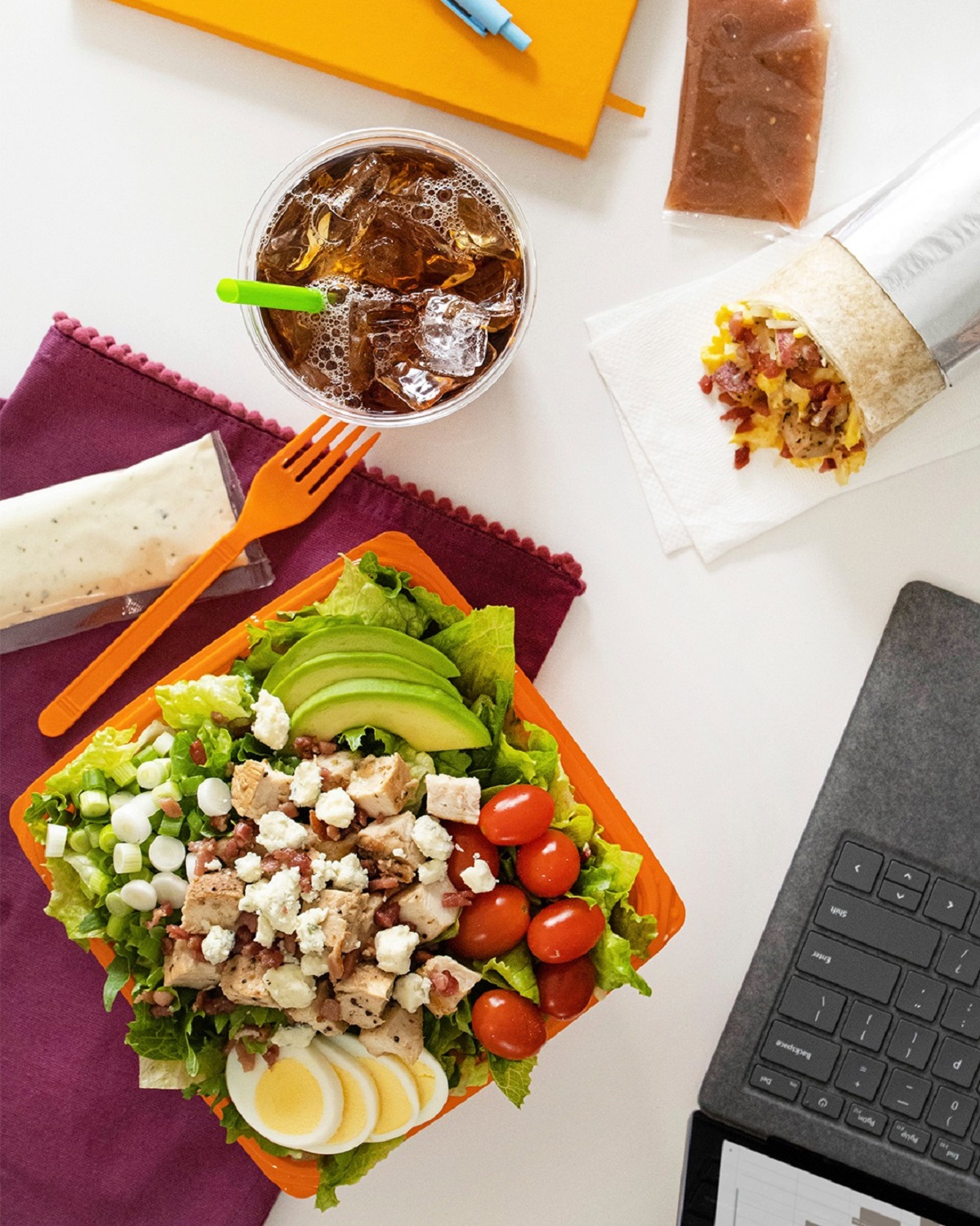 The chef-curated menu includes salads featuring a variety of fresh ingredients plus your choice of protein—roasted chicken or tofu, or steak for an additional fee. Salad options include Cobb, Greek, Caesar, and others. Salads can also be made into wraps. Breakfast burritos, soups, and hand-crafted lemonades are also available.
