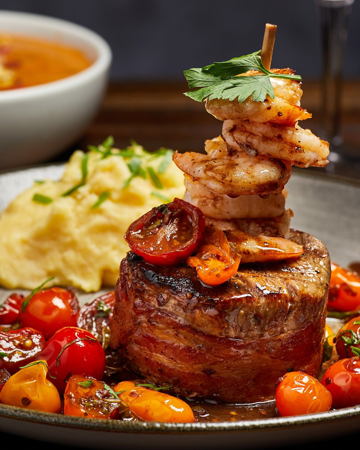 Shareables such as Lobster Spinach Queso, Philly Cheesesteak Egg Rolls, and Seared Ahi Tuna are available, along with soups, salads, handhelds, and specialty pasta dishes.