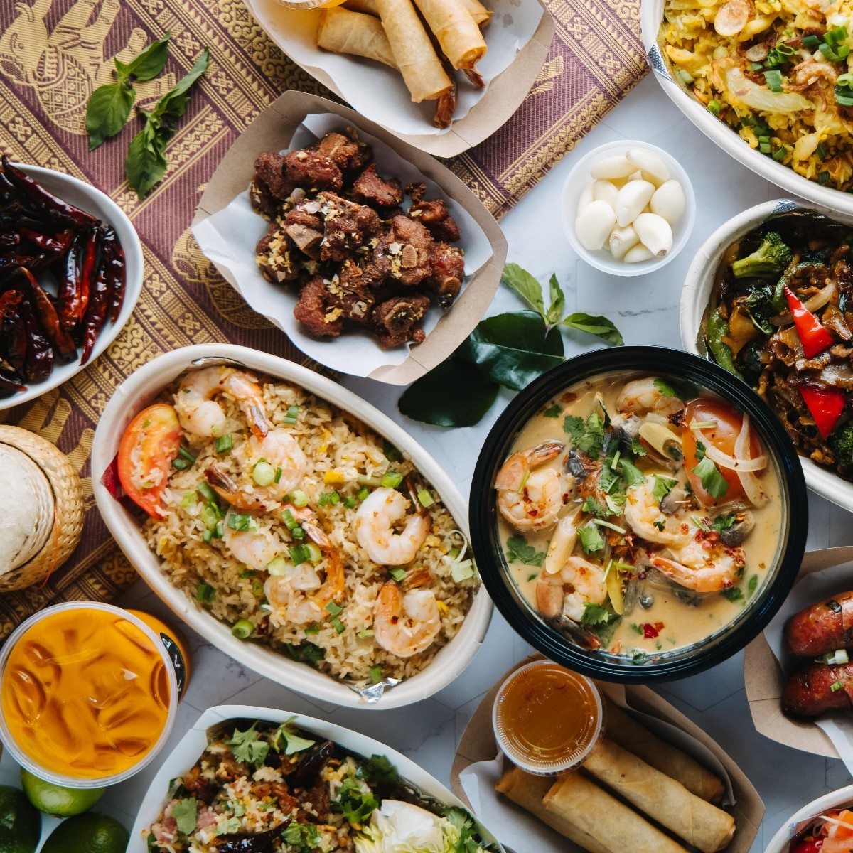 The menu features curries and noodle dishes such as Pad Thai. You can try a variety of fried rice dishes, soups featuring your choice of protein—chicken, beef, pork, tofu, shrimp, or a combo, or a number of salads including Lao Style Papaya Salad.