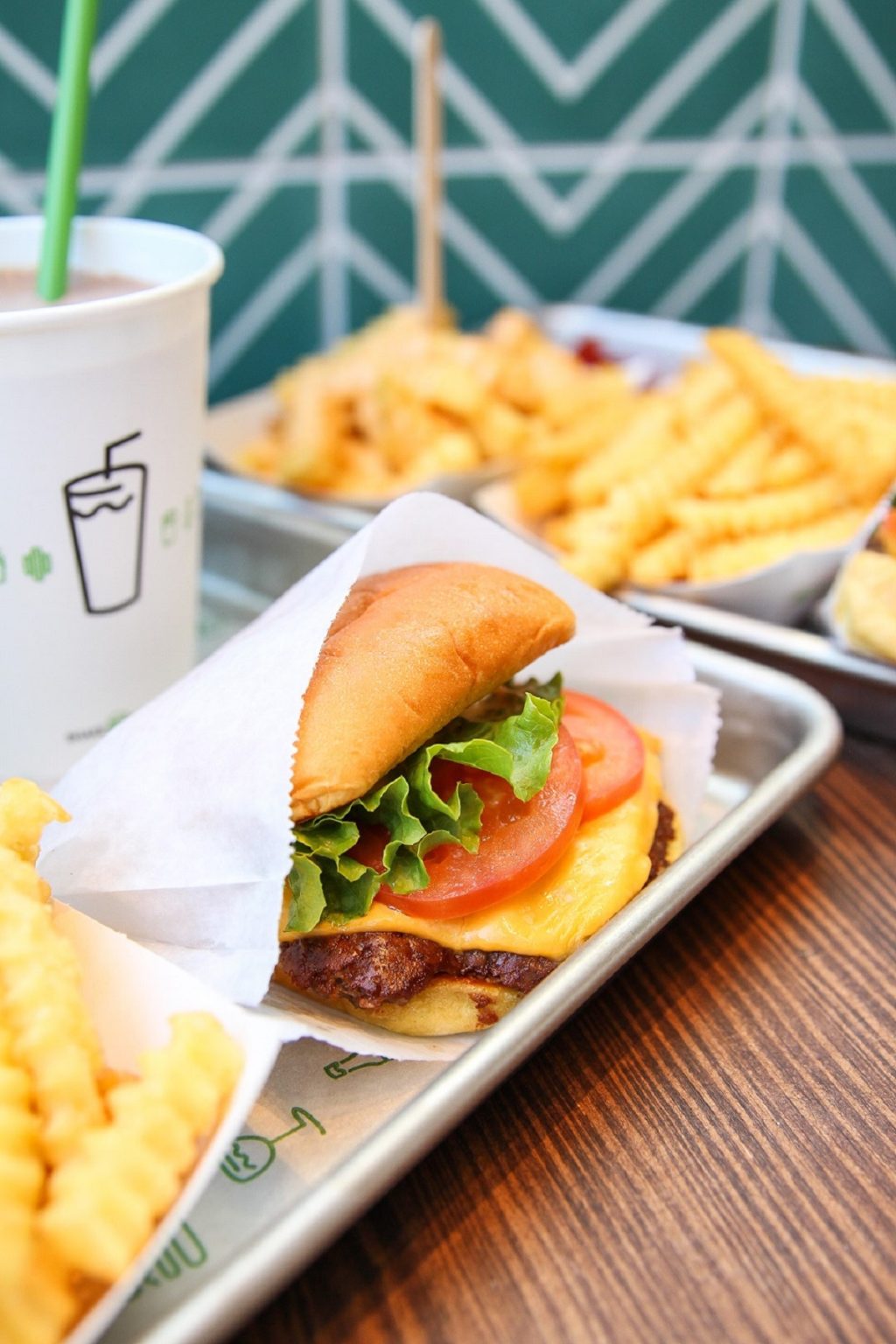 The New York-based chain offers a variety of burgers, including beef, chicken, and a fried portobello mushroom option. Shakes, floats, and custards are also on the menu.