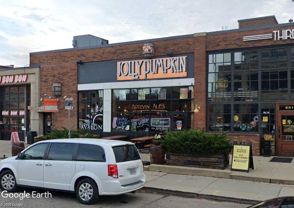 Jolly Pumpkin was on the south side of W Canfield Street, between Bon Bon Bon dessert shop and Third Man Records, music artist Jack White’s record store. Other concepts nearby are Mario’s Northern Italian Cuisine, Shinola Cafe and Cobb’s Corner Bar.
