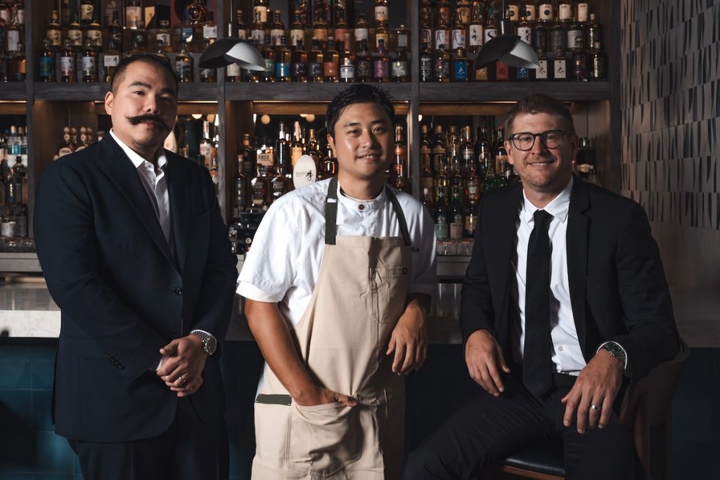 Handies Douzo will occupy a 1,658 square-foot space. Designed in collaboration with Gin Design Group, the moody space, clad in inky tones and matte black finishes, is undercut by a rubber-duck-lined chef counter seating 26 people.