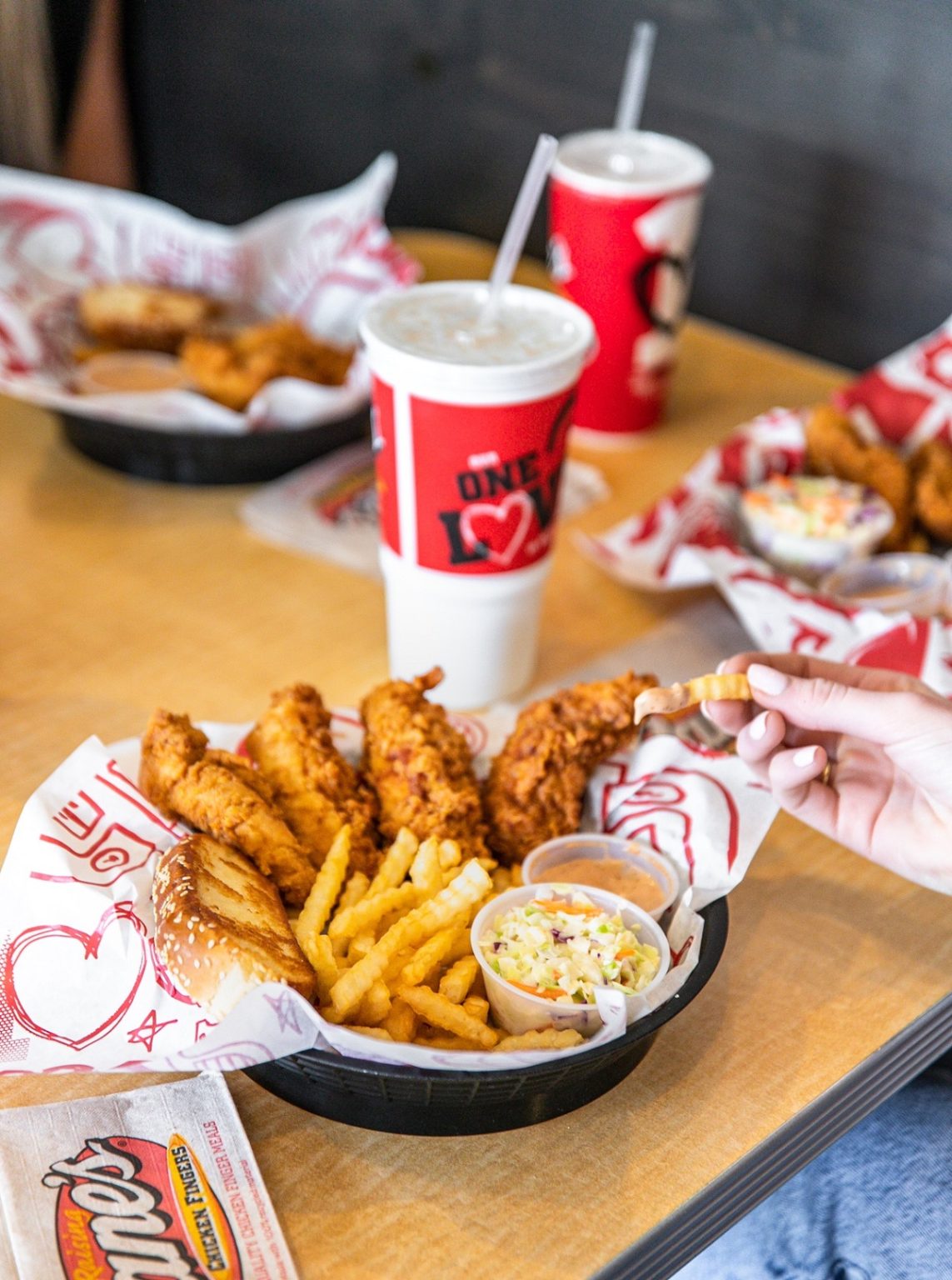 The chain is well-known for its limited menu of chicken fingers, crinkle-cut fries, coleslaw, Texas toast, and Cane’s Sauce. You can also try the chicken fingers on a sandwich with a cup of fresh lemonade or sweet tea.