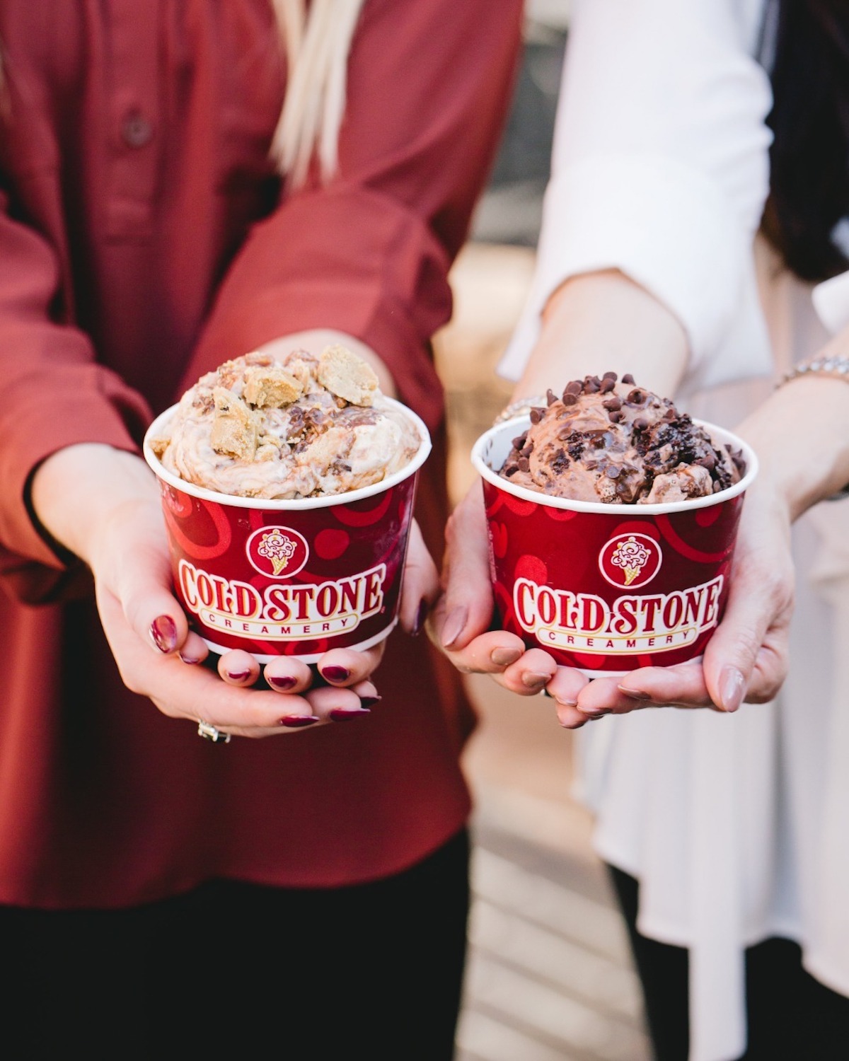 Cold Stone Creamery offers a build-your-own option for its ice cream, which is Kim’s approach: her current favorite combination is Sweet Cream ice cream with Heath Bar and caramel. Acesa goes with Chocolate Devotion, one of Cold Stone’s Signature Creations: chocolate ice cream with chocolate chips, brownie, and fudge.