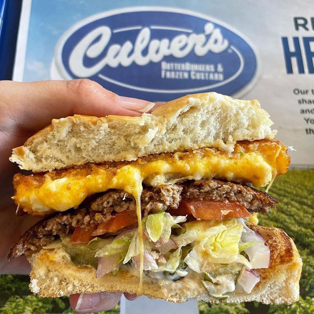 Culver’s branded Butterburgers come in varieties like the Bacon Deluxe, “with layers of real Wisconsin cheese and crisp bacon,” and the Culver’s Deluxe, with Wisconsin cheese, lettuce, tomato, pickles, red onion, and Culver’s signature mayo. The menu also features chicken sandwiches and tenders, plus seafood sandwiches and dinners like the Butterfly Jumbo Shrimp Dinner and the North Atlantic Cod Dinner.