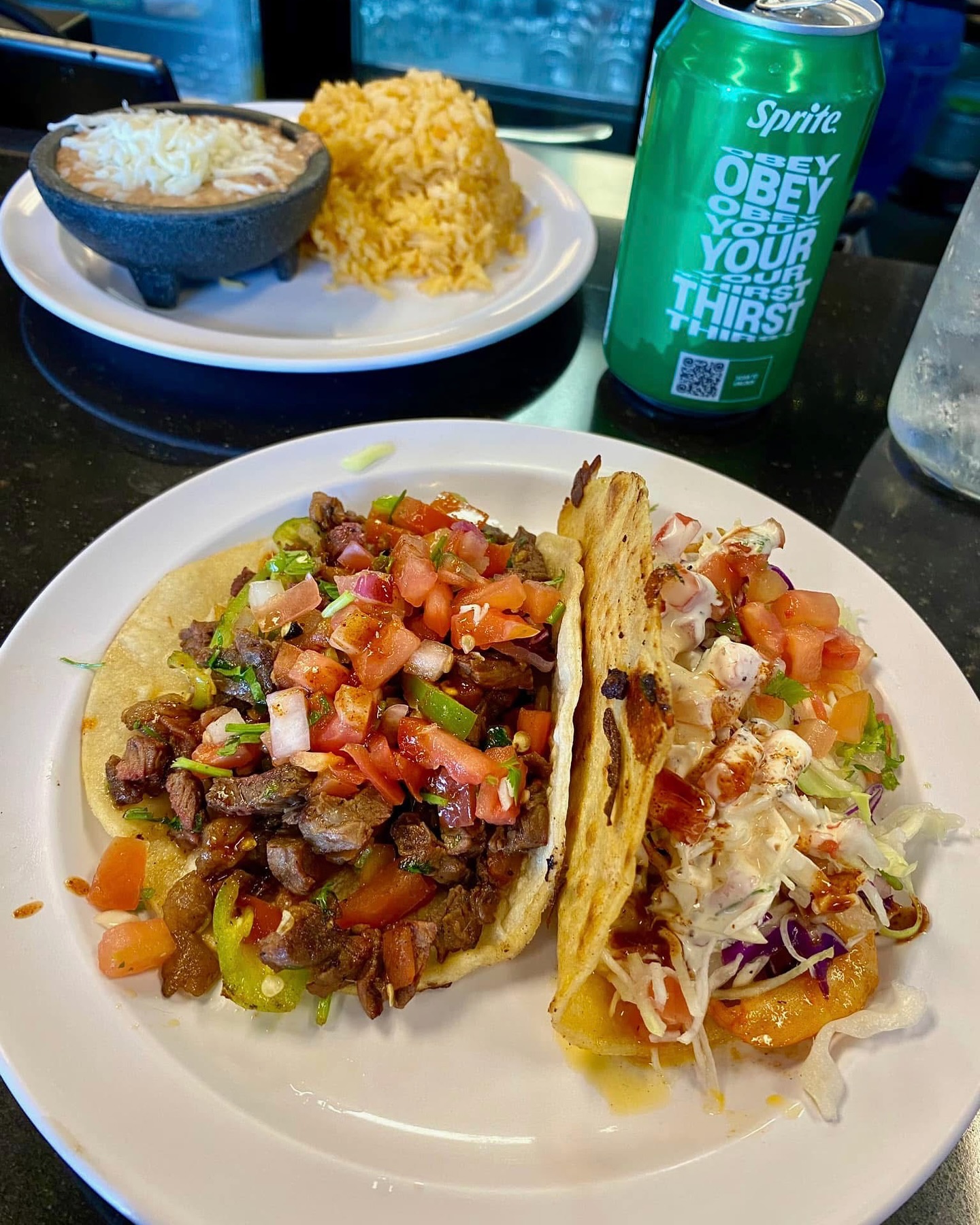 Bajamar Seafood & Tacos: Two Tacos plates with rice, beans, and a Sprite.