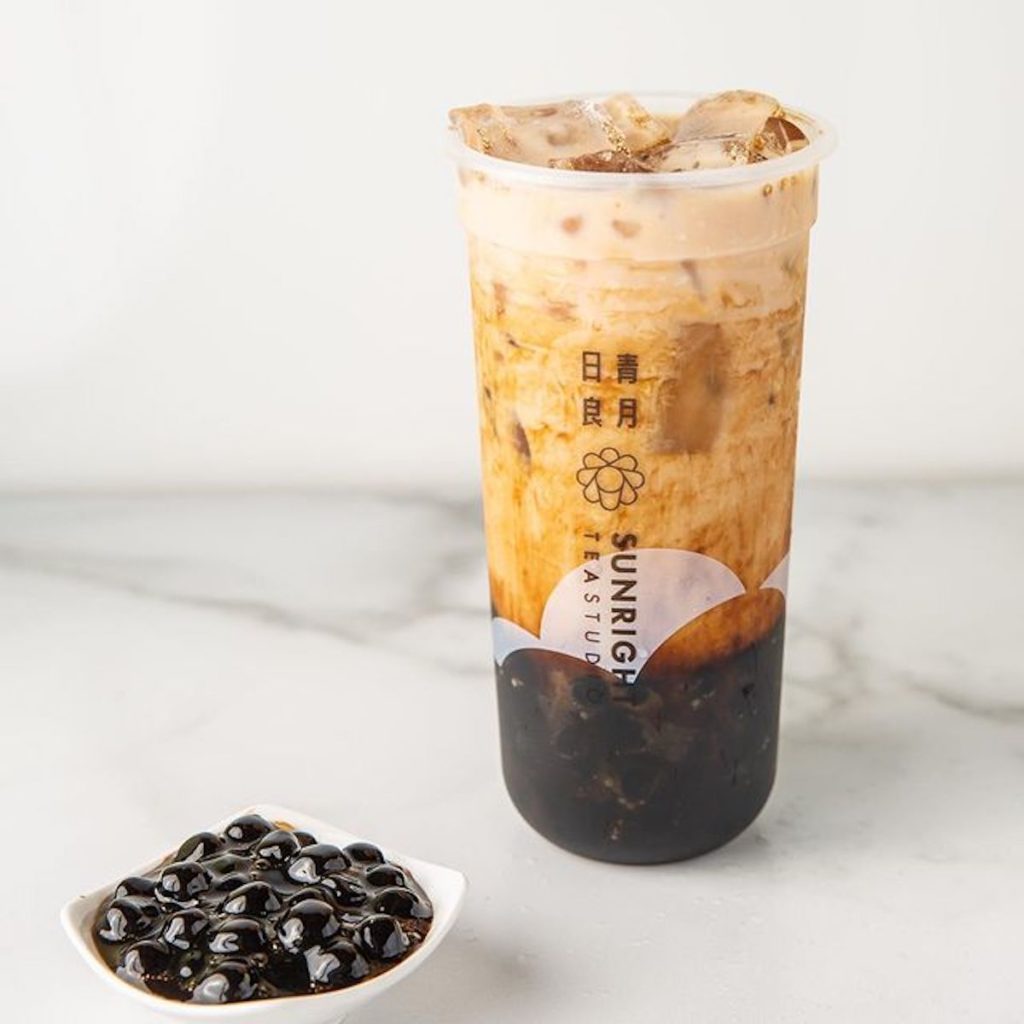 Sunright Tea Studio’s menu of boba tea drinks opens with beverages foregoing the tea: for example, Oreo Brûlée Boba Milk (Creme brûlée foam and crushed Oreos combined with sweetened fresh milk and served with boba). Milk Tea Flavors include Sunright Boba Milk Tea, Jasmine Milk Tea, and Taro Milk Tea. Selections of Original Teas, Sunny Fruit Teas, Frosties, and coffee drinks are also available.