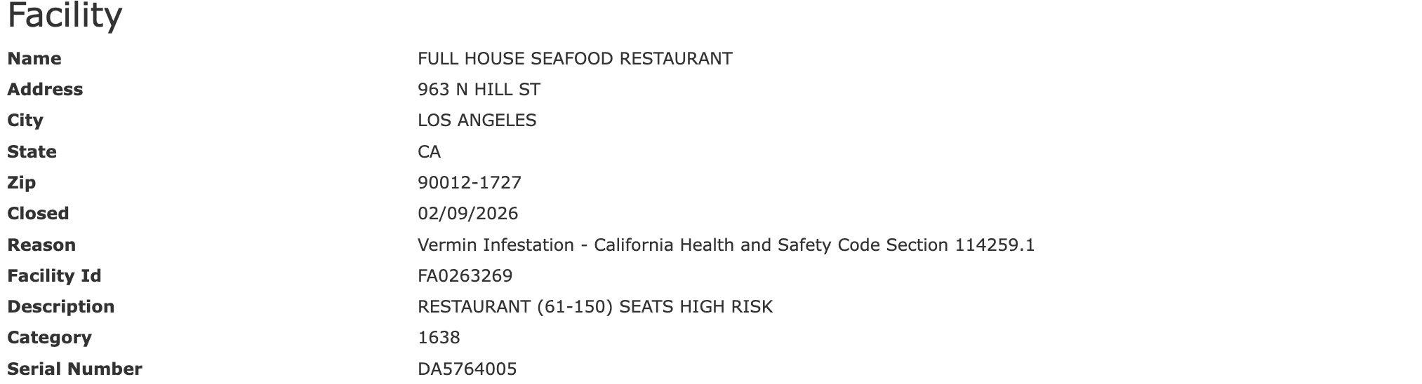 The Los Angeles health department conducted multiple inspections in the area on February 9. Among them, Full House Seafood Restaurant was found in violation of several food codes, which resulted in the temporary closure of the restaurant.