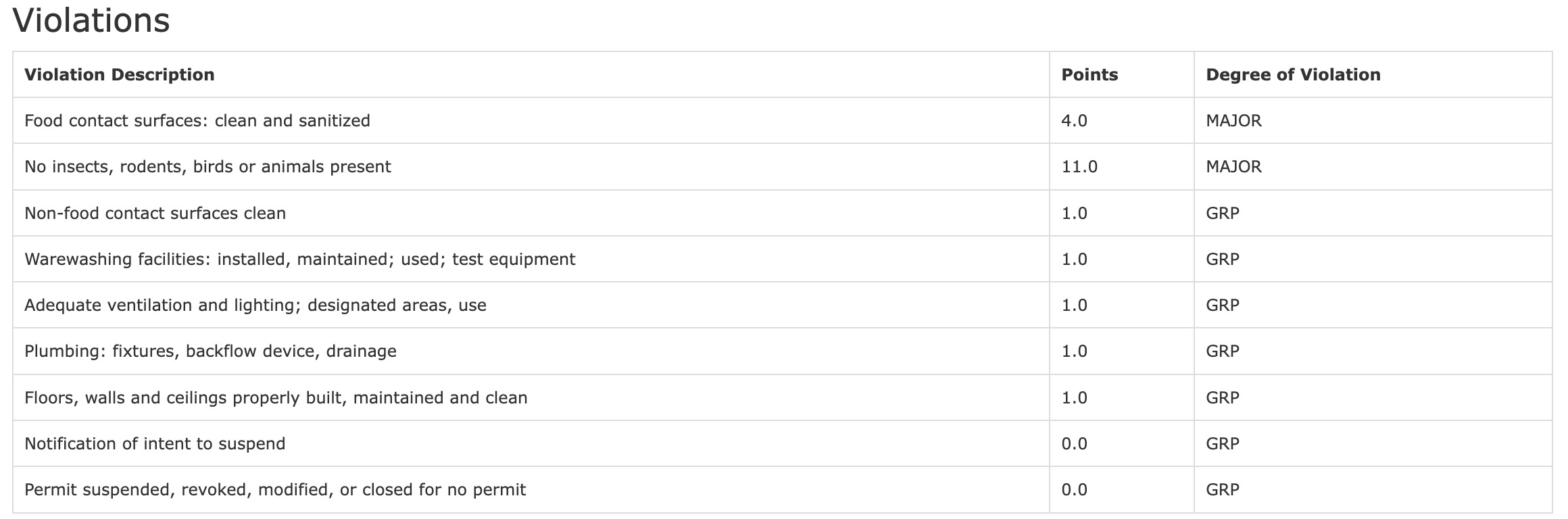 - The food contact surfaces were not properly cleaned and sanitized, which was marked as a major violation.