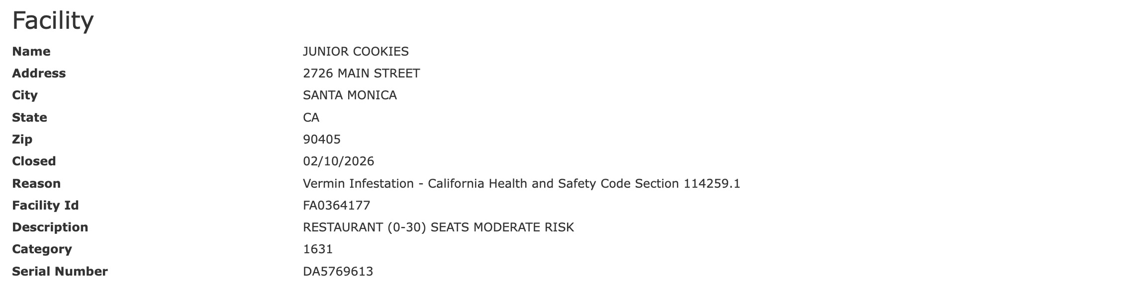 During an inspection conducted on February 10 by the Los Angeles Health Department, Junior Cookies was found in violation of several health codes. The eatery was recommended to shut down following the inspection.
