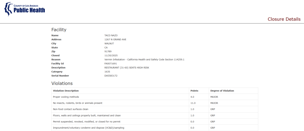 The County of Los Angeles Public Health carried out health inspections at multiple food facilities on November 20. Taco Nazo was cited for multiple violations by the California Health and Safety Code, which were listed in a detailed report. Out of these, the facility was temporarily closed that day due to a vermin infestation.