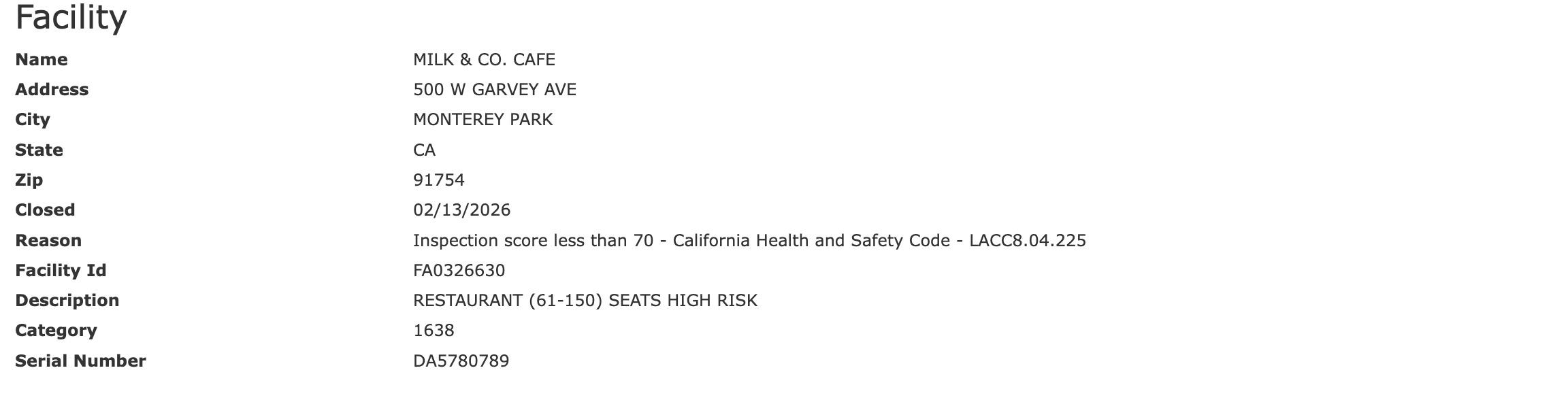 The Los Angeles health department inspected Milk & Co Cafe on February 13. The restaurant was recommended to shut down after it was flagged for major violations and scored less than 70.