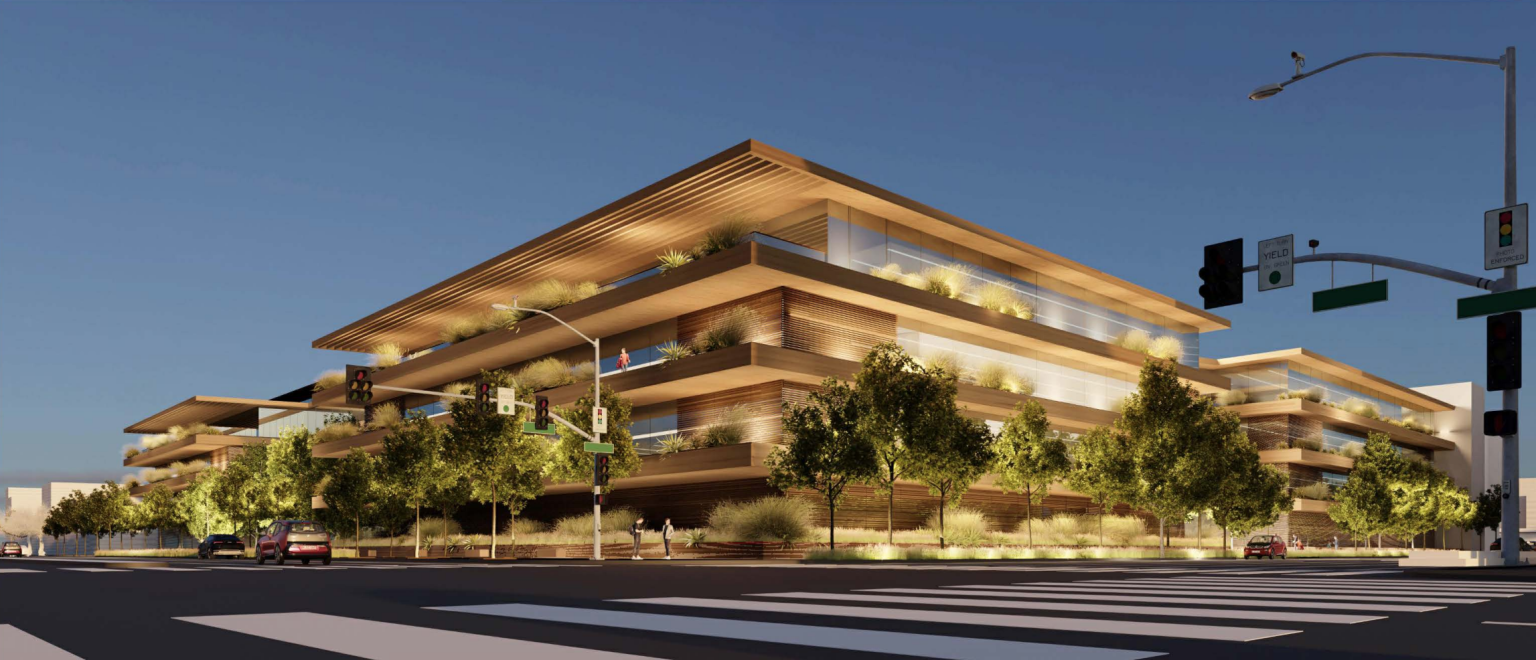 Amenities would include a cafeteria, coffee stations, employee shuttle service, and “other ancillary uses typical of an integrated office complex development,” according to application documents. Planned outdoor space such as a central courtyard is also part of the project proposal.