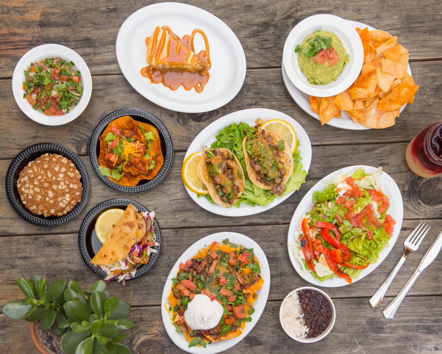 The menu focuses on gourmet tacos, burritos, quesadillas, and Texas-style ribs. Other offerings include stacked nachos, several flavors of cheesecake, and housemade lemonades. Vegetarian options are also available.
