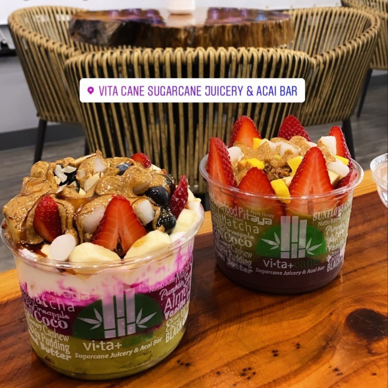 Vita Cane offers vibrant, healthy, and delicious superfoods and premium drinks, such as acai bowls, coconut pudding bowls, Raspberry Limojitos, and So Matcha Love. Its all-encompassing drink menu offers every color and flavor in the rainbow.