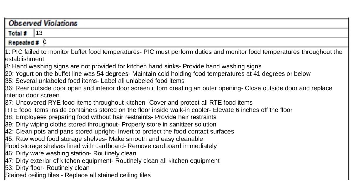 - The report found the establishment’s floors were dirty, and the ceiling tiles were stained and required replacement.