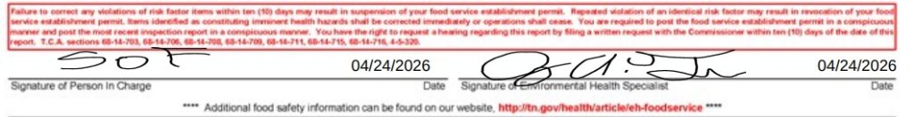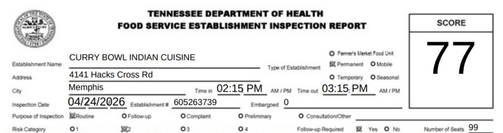 The Tennessee Department of Health conducted a routine health inspection at Curry Bowl Indian Cuisine on April 24. During the inspection, the restaurant was cited for multiple health code violations.