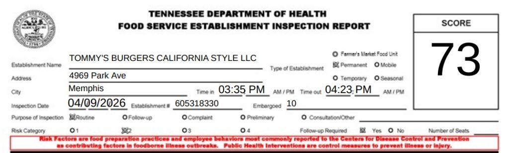 The Tennessee Department of Health conducted a routine inspection at Tommy’s Burger California Style in Memphis. The inspection report cited multiple health code and safety violations.