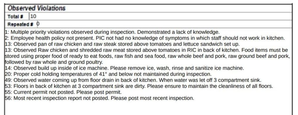 - The inspection report noted that a pan of raw chicken and steak was kept above tomatoes and food.
