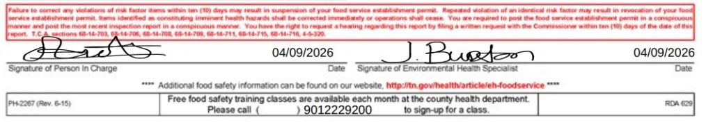 On April 9, 2026, the restaurant received a score of 73. The restaurant must correct all violations before a follow-up inspection.