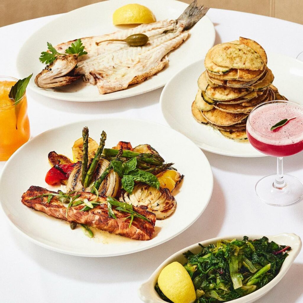 Avra Miami’s dinner menu features appetizers like Tuna Tartare, Grilled Octopus, and Portuguese Sardines, along with a raw bar and caviar. Entrees “From the Sea” include Chilean Sea Bass Plaki (oven-baked, Vidalia onions, potato, light tomato fish broth, fine herbs) and Lobster Pasta with linguine and a light tomato sauce. “From the Land” come entrees like simply grilled Lamb Chops and a 32oz American Wagyu Cote de Boeuf (Snake River Farms, aged for 30 days, housemade onion rings, and truffle fries).