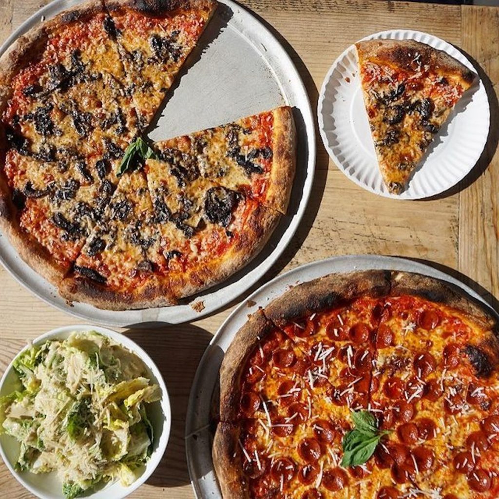 Eleventh Street’s menu features round pizzas and Sicilian square pies. They come in varieties like La Provencal (organic Bianco Di Napoli tomatoes, confit garlic, roasted red onions, zucchini, basil, pepperoncini) and Pepperoni & Hot Honey (organic Bianco Di Napoli tomatoes, mozzarella, pepperoni, roasted red onion, Calabrian chili paste, honey). Pizza is also available by the slice if you order in-store.