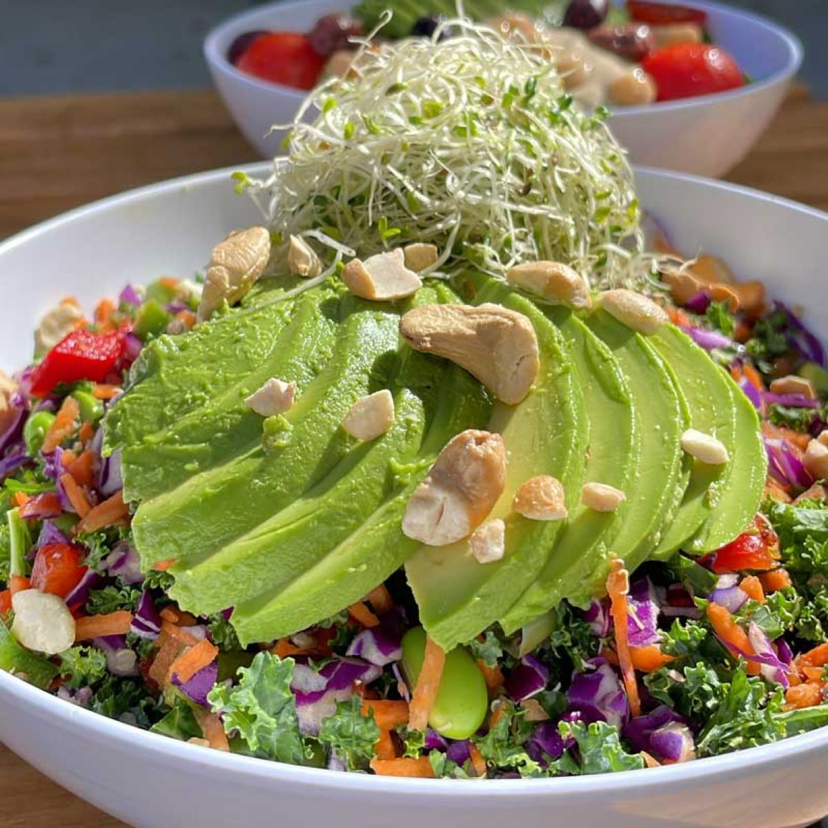The menu offers premium salads like the “Full of Life” with arugula, spinach, roasted chicken, quinoa, craisins, almonds, cherry tomato, mint, feta, lemon & olive oil, and basil honey; and the “BBQ Chicken” with field greens, romaine, BBQ chicken, jack cheddar, corn salsa, black beans, tomato, crushed tortilla chips, and BBQ ranch. Sandwiches include the “Carver” with roast beef, goat cheese, arugula, tomato, pickled red onion, and Dijonnaise, on toasted multigrain bread; and the “Junk Beach” with roasted turkey, romaine, guacamole, Swiss cheese, sprouts, tomatoes, and cucumber on a baguette. The menu also includes soups, smoothies, and juices.