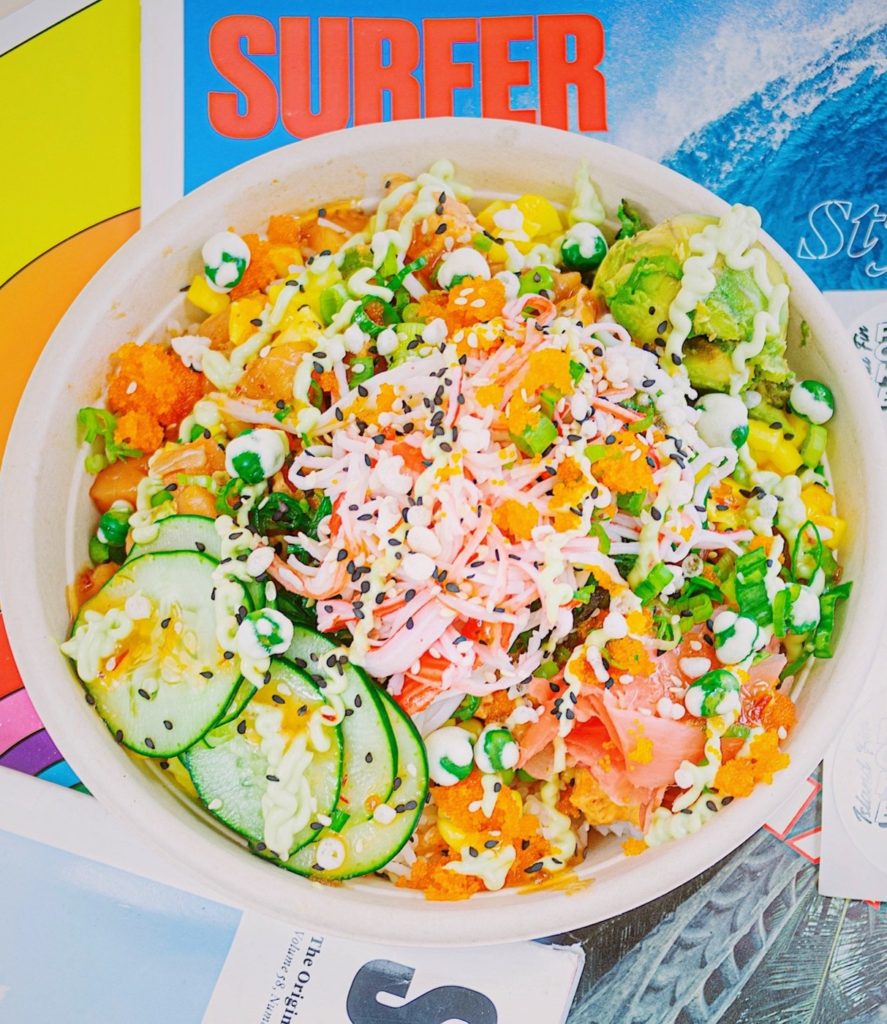 Island Fin Poke restaurants serve build-your-own bowls that include a choice of rice or spring mix greens, a choice of fresh protein like Ahi tuna or salmon, a choice of mix-ins like edamame and corn, a choice of a marinating sauce and a choice of final toppings like cucumber and chili flakes. To see all of the bowl toppings, visit their online menu.