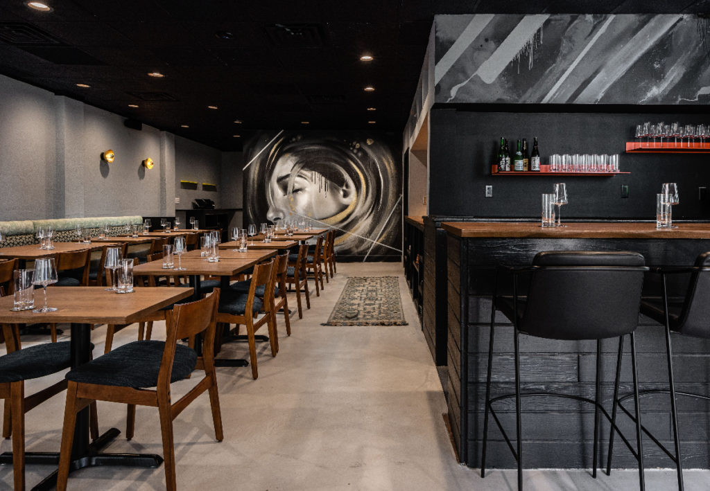 Upon entering through the double doors, guests are greeted by the familiar sounds of old school hip hop, classic rock anthems and 80’s dance music. Hand-painted lion frescos by Canadian muralist, Derkz, adorn the walls exuding a sense of eccentricity. Ambient lighting and dark, moody tones are paired with warm woods, creating a polished, inviting atmosphere. A wall lined with cozy banquettes and walnut tabletops provide ample indoor seating for guests. Plateware is all uniquely handcrafted by independent ceramists hailing from New York City and Los Angeles while the pink-and-purple cutlery is French-imported.