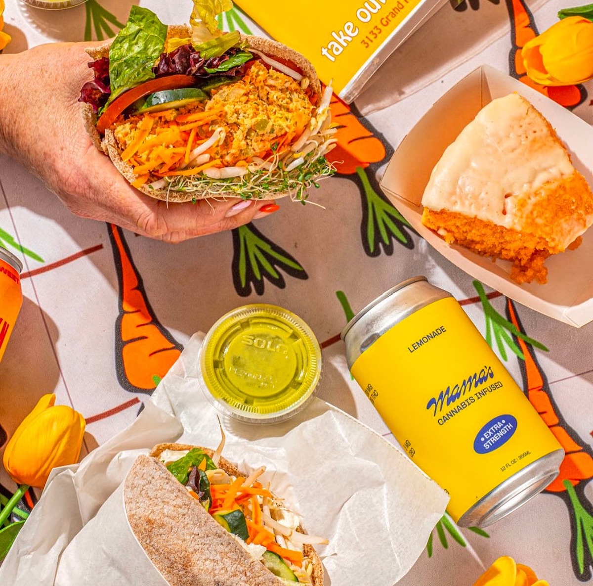 Popular items from the Last Carrot’s menu include the Chicken Pita Sandwich, the Falafel Pita, the Chicken Salad (Chicken, carrots, cucumber, tomato, sprouts, lettuce, vinaigrette, or herbal dressing), and the Hummus Pita Sandwich.