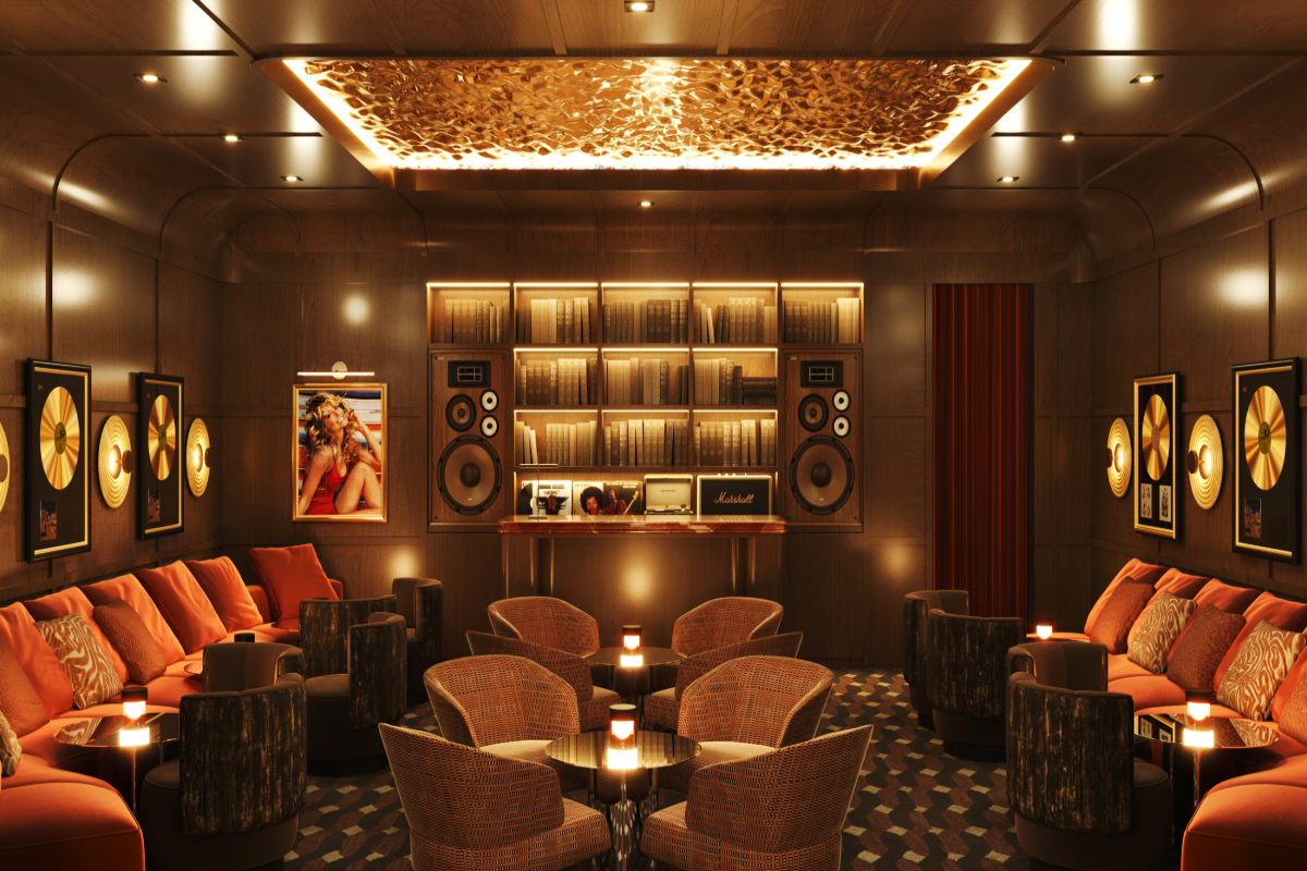Designed by AMA Designs, The 400 Vinyl Room features warm textures, amber light, where record shelves line the walls, framed gold albums shimmer under curated spotlighting. The bar anchors the room with quiet authority behind deep velvet curtains and bespoke furnishings. Curved banquettes and intimate table groupings invite lingering conversation. The aesthetic draws inspiration from 1970s hi-fi culture and the underground vinyl bars of Tokyo, where dim lighting, carefully curated sound systems, and intentional programming create an almost sacred environment for music lovers. Every design element, from lighting to seating configuration, has been carefully considered to enhance the vinyl listening experience,