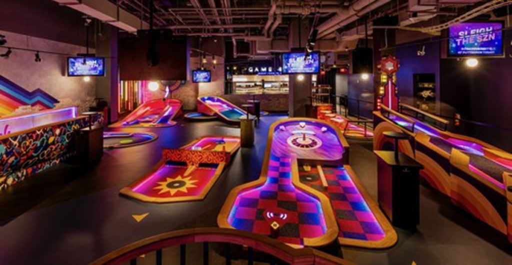 Puttshack Miami occupies 27,000 square feet, including an outdoor terrace with seating capacity for up to 96 people that overlooks the Miami cityscape. It features three nine-hole competitive mini golf courses complemented by food and beverage offerings and event space.