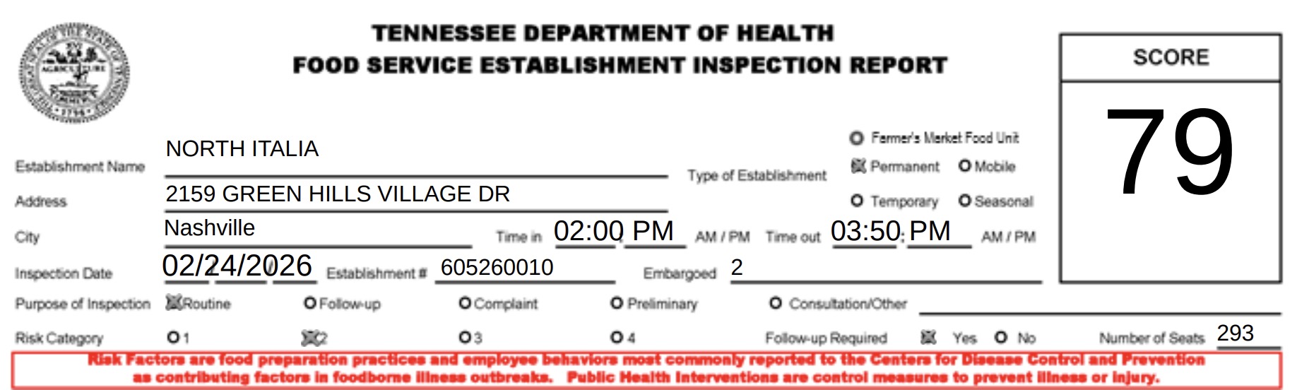 North Italia underwent a routine health inspection by the Tennessee Department of Health on February 24. The eatery was found in violation of multiple health regulations, earning a low score of 79.