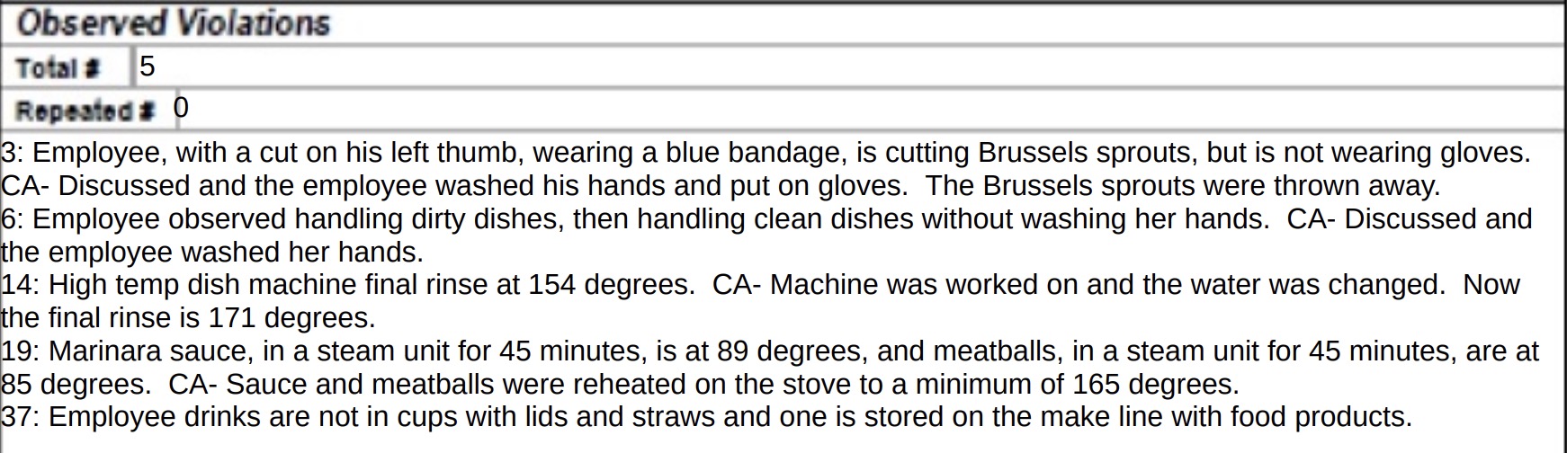 • The report noted that an employee was handling dirty dishes and then handling clean dishes without washing their hands. The issue was discussed, and the employee washed her hands immediately.
