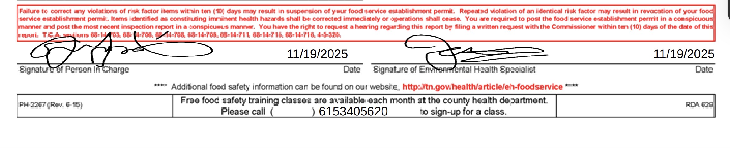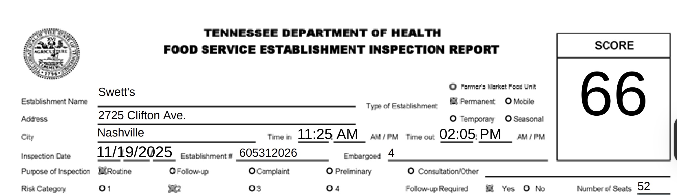 On November 19, the Tennessee Health Department conducted a routine health inspection at Swett’s. The restaurant was cited for multiple health code violations, including improper storage of food items and poor maintenance, resulting in a low score.